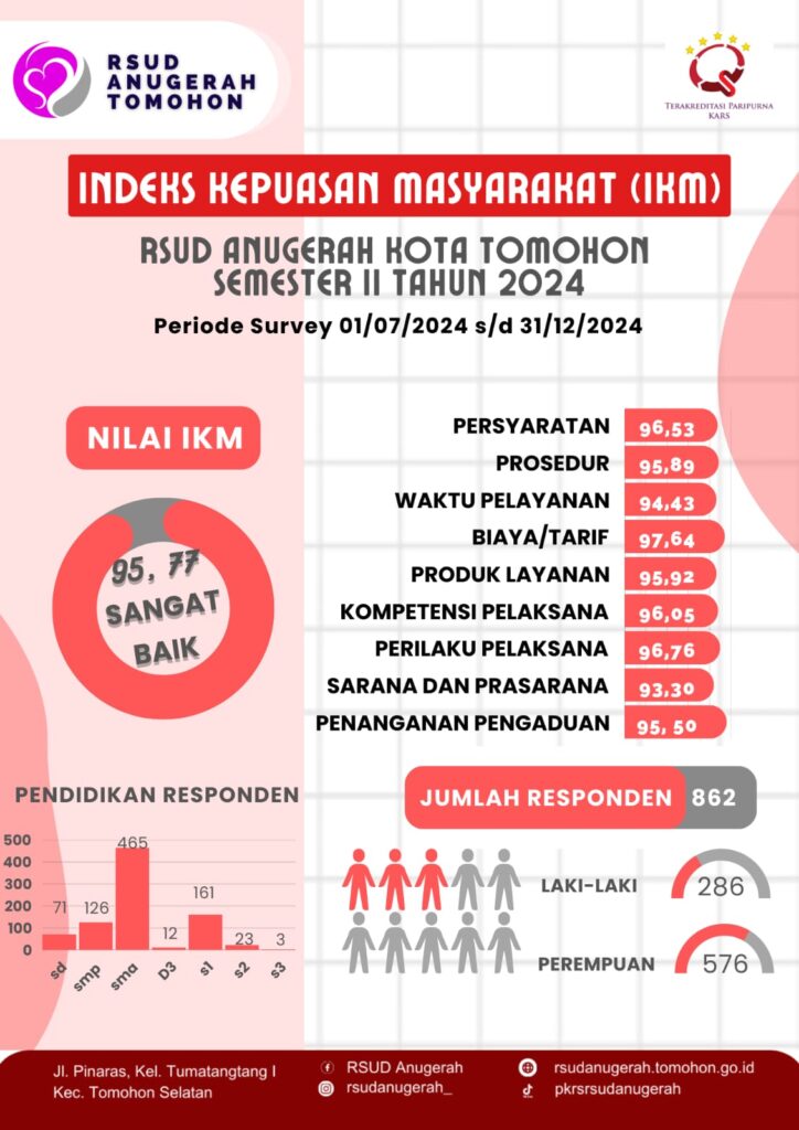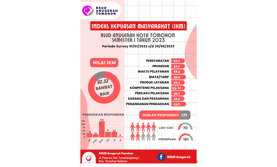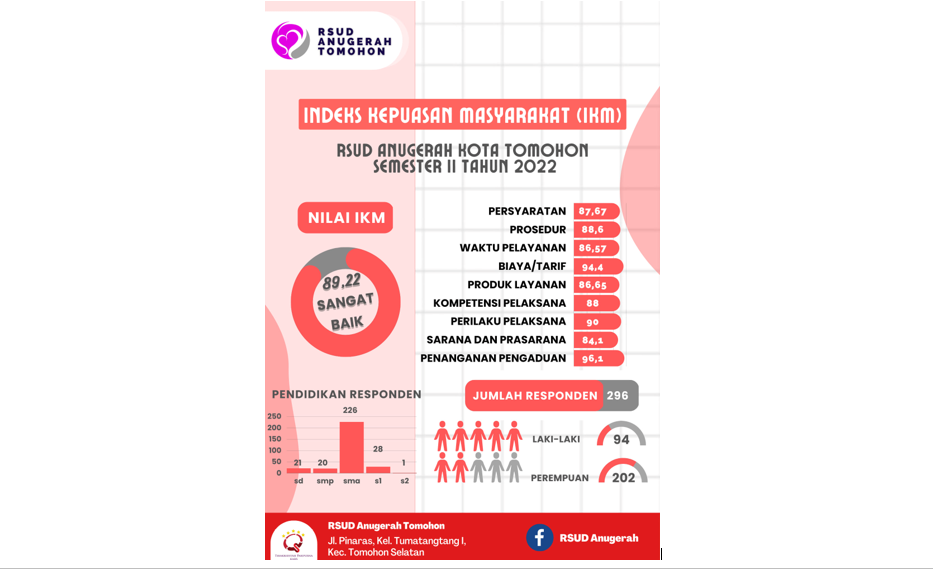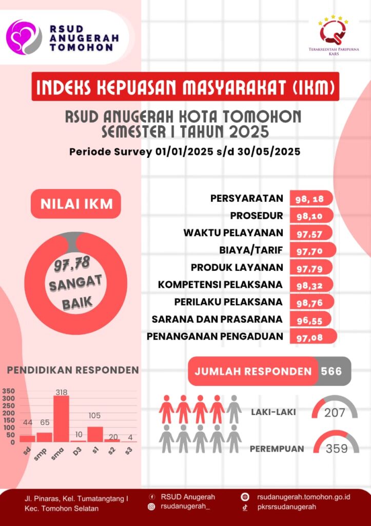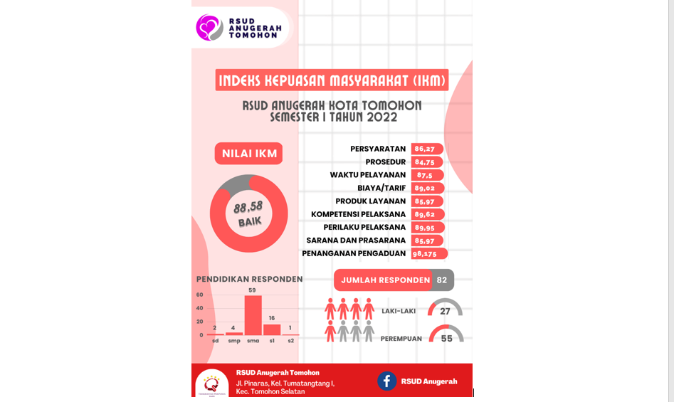 Rumah Sakit Umum Daerah Anugerah Tomohon sebagai salah satu institusi pelayanan publik yang memberikan pelayanan di bidang kesehatan, sehingga kualitas pelayanan harus dapat memenuhi kebutuhan masyarakat. Indeks Kepuasan Masyarakat (IKM) yang merupakan hasil dari penilaian langsung oleh masyarakat sendiri. IKM telah menjadi salah satu tolak ukur dan bahan acuan untuk meningkatkan kualitas pelayanan yang diberikan oleh RSUD Anugerah.